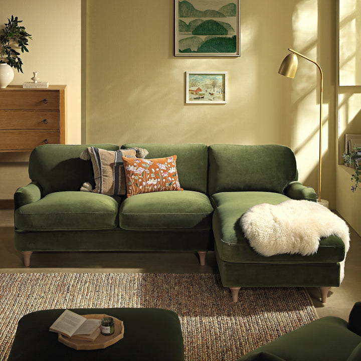 Daphnis Fern Green Velvet Sofa, Grande Chaise Sofa Left Hand Facing
